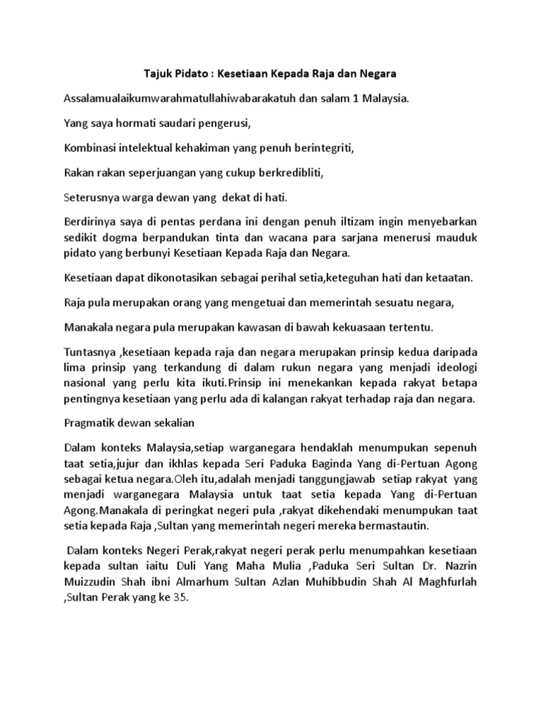 Esei Diraja from cdn.slidesharecdn.com Ceramah kesetiaan kepada raja dan negara february 1, 2018. Menyatakan identiti identiti bendera malaysia. Instagram @this.7 thanks for watching. Setiap warga negara indonesia mempunyai tugas dan kewajiban yang sama yang terdapat pada uud 1945. Rukun negara meletakkan unsur kesetiaan kepada raja dan negara untuk dipertahankan sebab ia adalah panduan hidup rakyat malaysia untuk mendukung perlembagaan negara. Detect language afrikaans albanian arabic armenian azerbaijani basque belarusian bengali bosnian bulgarian catalan cebuano chichewa chinese chinese traditional croatian czech danish dutch english esperanto estonian filipino finnish french galician georgian german greek gujarati haitian. Justeru, prinsip kesetiaan dan ketaatan kepada raja dan negara menjadi unsur dan ciri penting dalam soal kewarganegaraan di negara ini. Tanggung jawab kewarganegaraan yang biasa adalah kesetiaan, perpajakan, dan dinas militer.